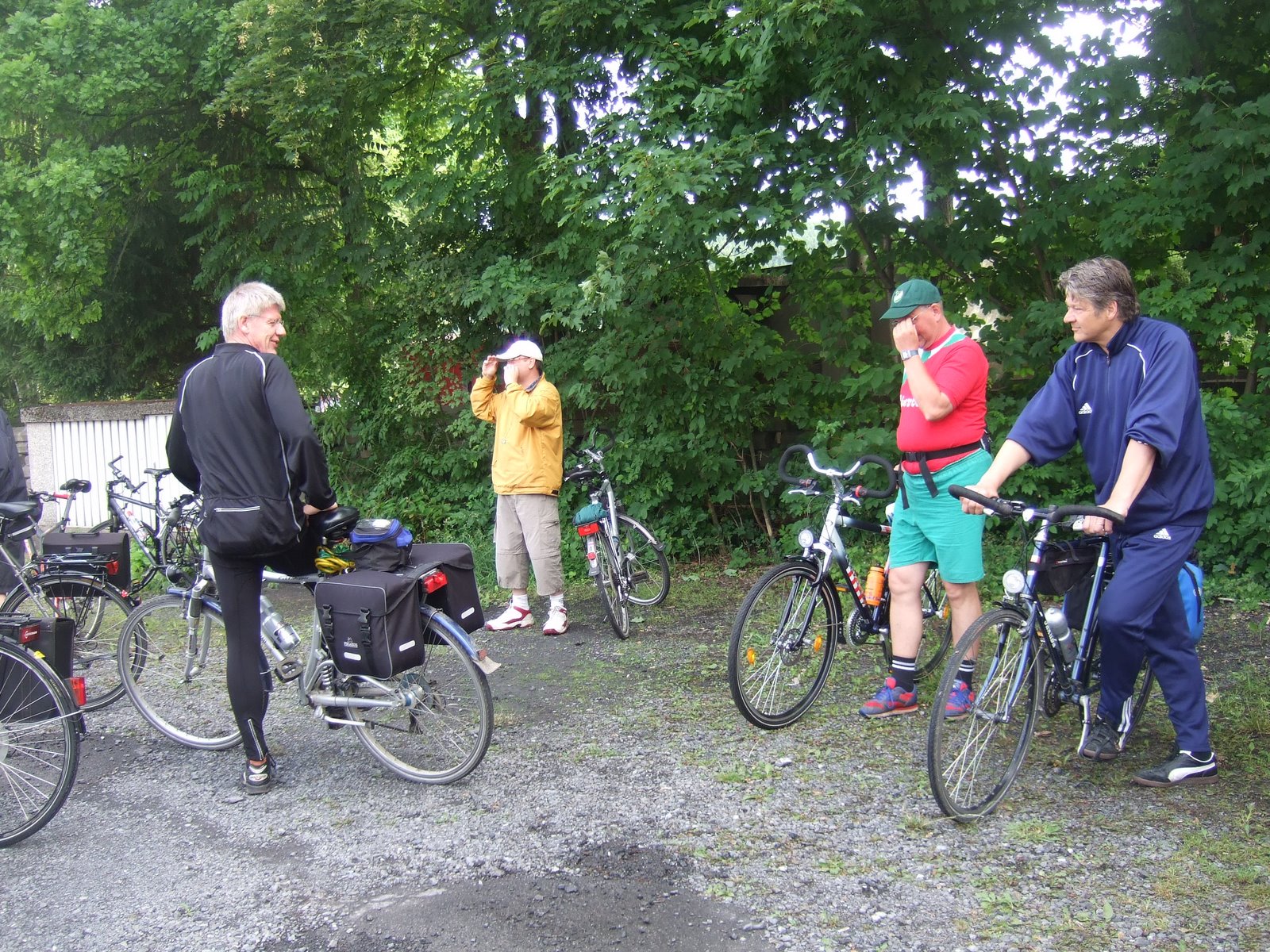 Manni ist bei einer Bergetappe von der Pedale gerutscht und hat sich einen Knieabriss zugezogen. Das hatte später noch Folgen. Der nächste Halt wurde ca. 45 km vor dem Ziel eingelegt, da ein paar Tropfen vom Himmel fielen. Nach ein paar Kuchen hätte es weitergehen können, aber Manni, oder besser Mannis Knie, war nicht mehr in der Lage weiter zu fahren. Klaus, der an diesem Ort ortskundig war, begleitete Manni zum Bahnhof und kam dann wieder zurück, die Tour wurde fortgesetzt. Der Regen war zwar weg, dafür ballerte die Sonne und der Wind. Es wurde jetzt schwerer, auch Werner, der im letzten Jahr noch mit seinem Krupp Rad mit Ledersattel unterwegs war, merkte auf seinem neuen Fahrrad jetzt die Strapazen. Aber dank des neuen Fahrrads und besonders der Bremsen, hat der Hund überlebt, der die Straße kreuzte:).