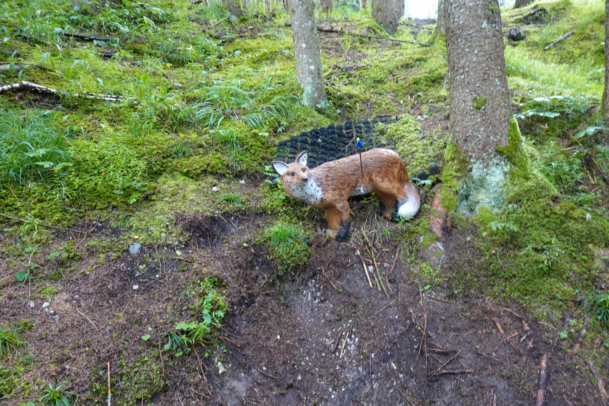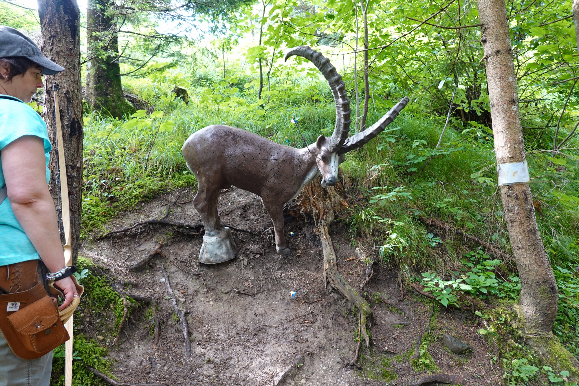 Der erste Schuss führte schon vom Waldrand ins dunkele Gehölz, dann ging es ein paar Ziele durch den Wald und dann wieder raus mit herrlichem Blick auf die Berge. Alles schön gestellt, die Ziele nicht zu klein und für den ungeübten auch mal ein Backstopp, wenn es seien sollte.