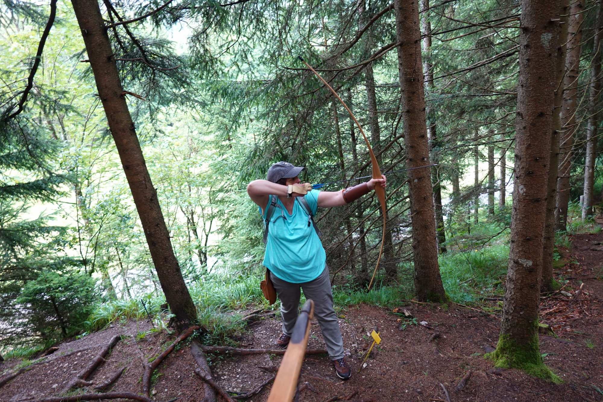 Einerseits macht es Spaß zu schießen, anderseits lädt das Gelände auch zum Verweilen ein. Bei Station 7 gibt es Getränke aus dem Erd- Eimer und einem herrlichen Platz zum ausharren mit Rundumblick auf Wald und Berg.