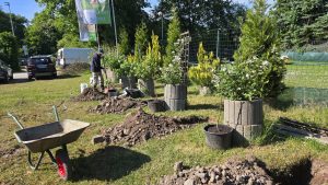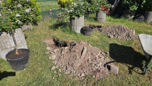 SO Freunde, Peter hat trotz starker Sonneneinstrahlung, was beim Buddeln nicht so förderlich ist, den Aushub für Birne, Apfel, Kirsche, Aprikose und Dingens eiskalt oder anders gesagt, handwarm und knallhart durchgezogen. Die Bienen freuen sich schon, ihren Job nachzugehen.