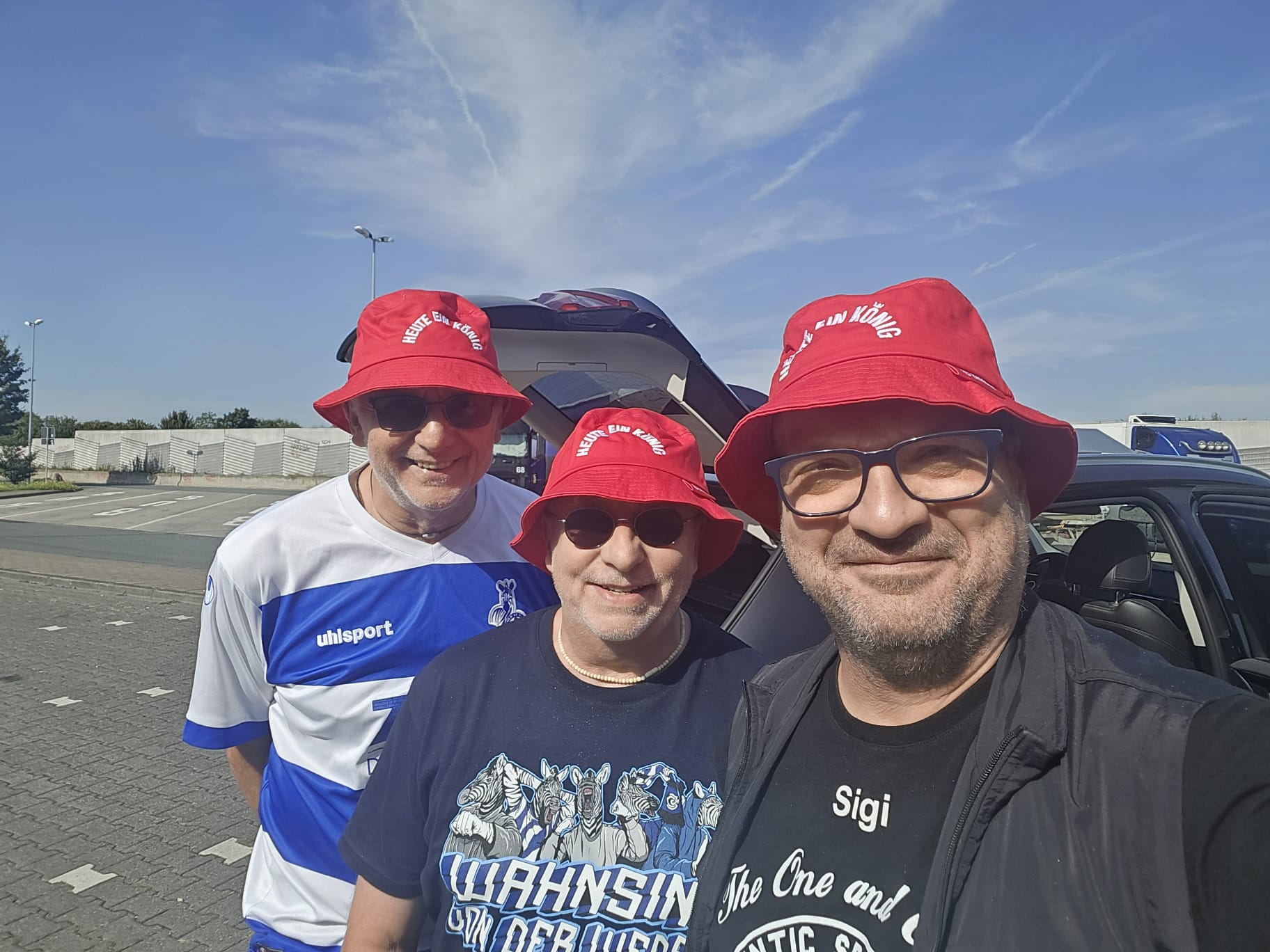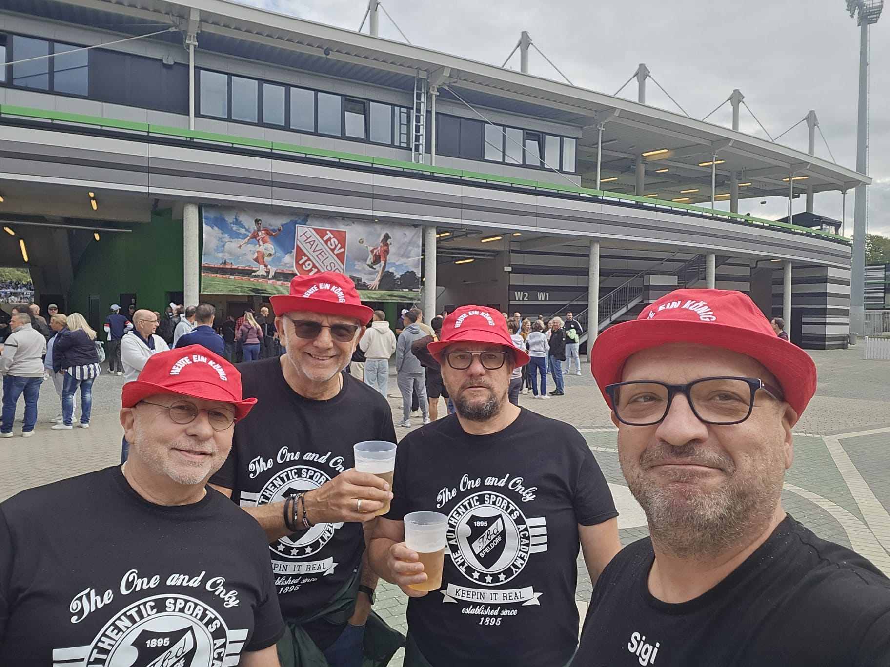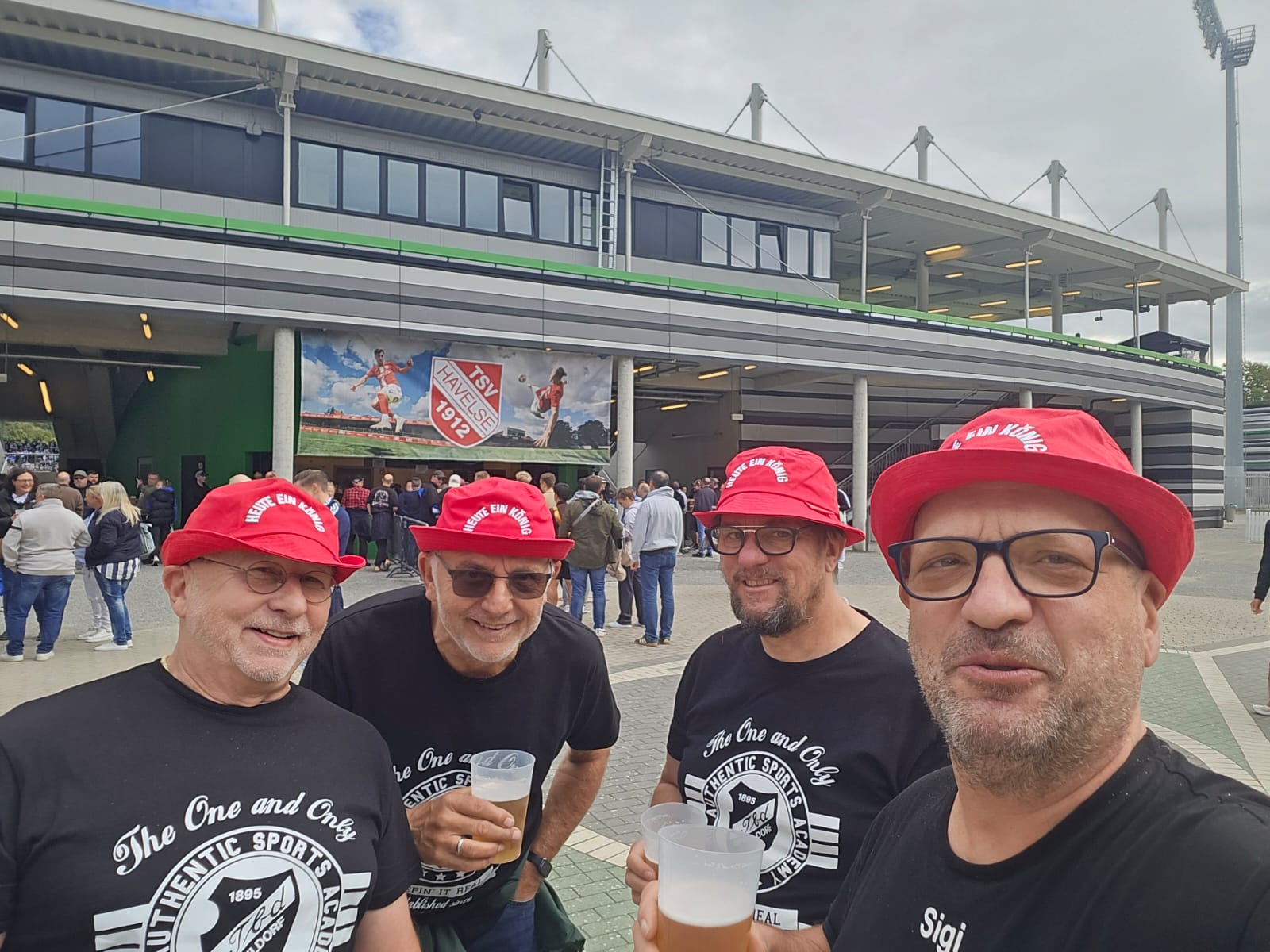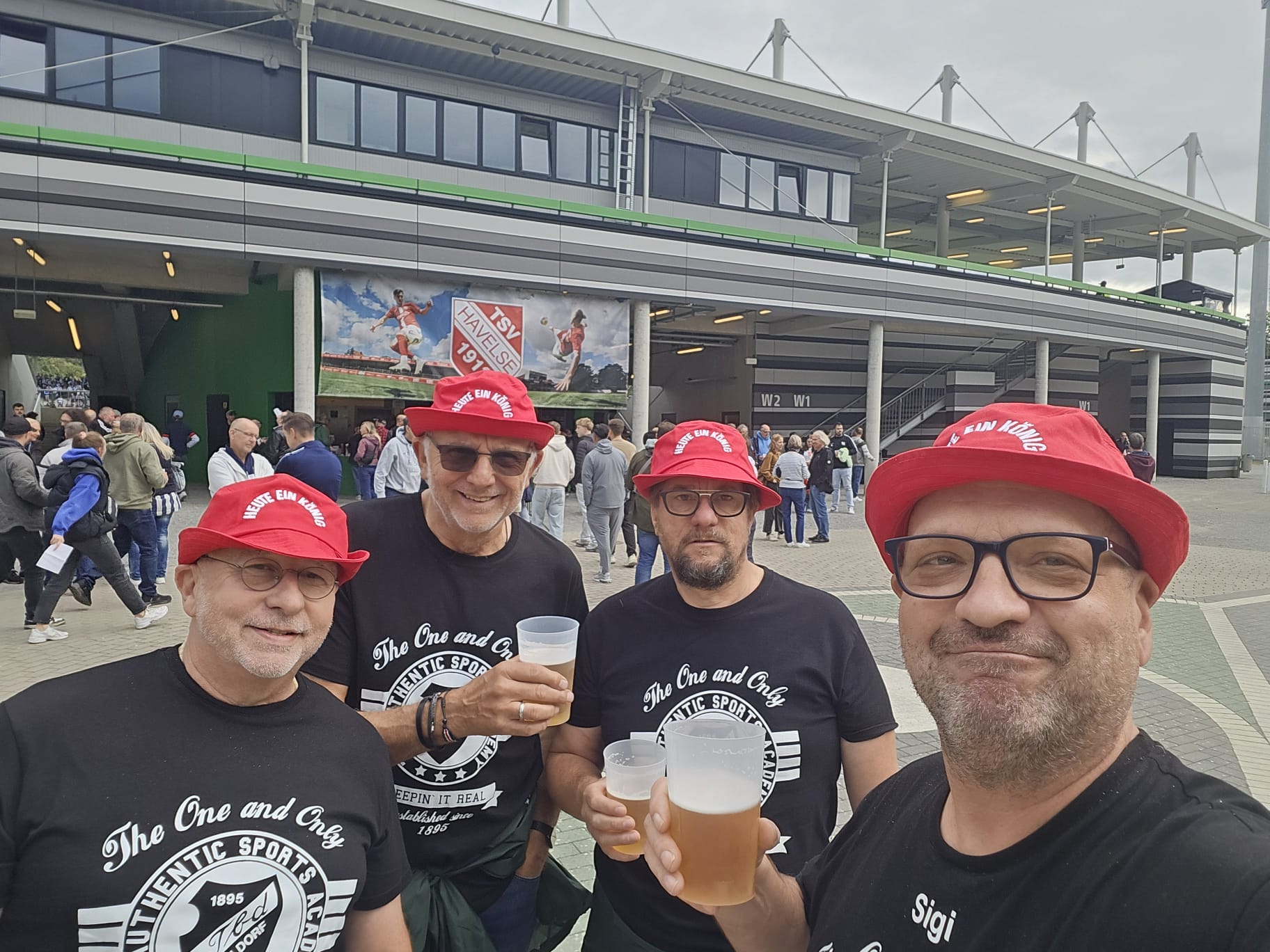 Mit roter Kappe und TBD- Shirt konnten wir problemlos die Haupttribüne besetzen. Ca. 30 Minuten hat es gedauert, bis jemanden auffiel das „Heute ein König“ auf den Mützen stand, jetzt waren wir enttarnt😉.